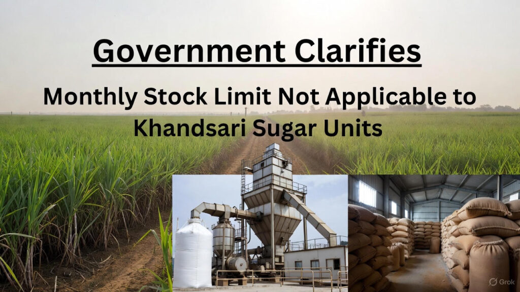 The Center has clarified that the monthly stock holding limit does not apply to Khandsari sugar units and no restrictions have been imposed on the sale of Khandsari sugar. The government has asked Khandsari units with capacity of 500 TCD and above to register on the NSWS portal under the Sugar (Control) Order, 2025.