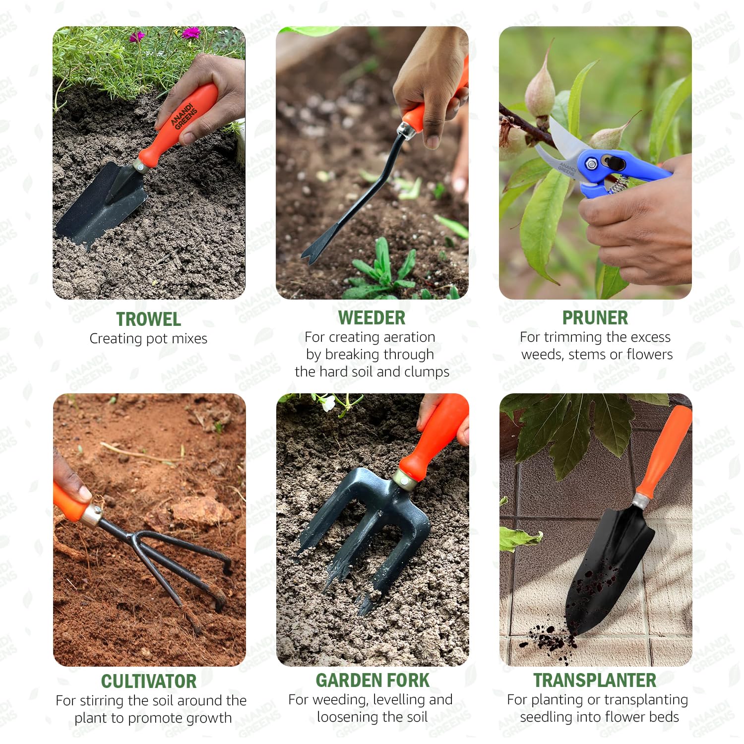 Anandi Green’s Metal Agriculture Gardening Tools Kit-10 Pcs (Cultivator, Fork, Trowels, Weeder, Garden Gloves, Pruner Cutter, Scissors, Seeds Packet, Tool packet) | Gardening Tools Set For Home Garden