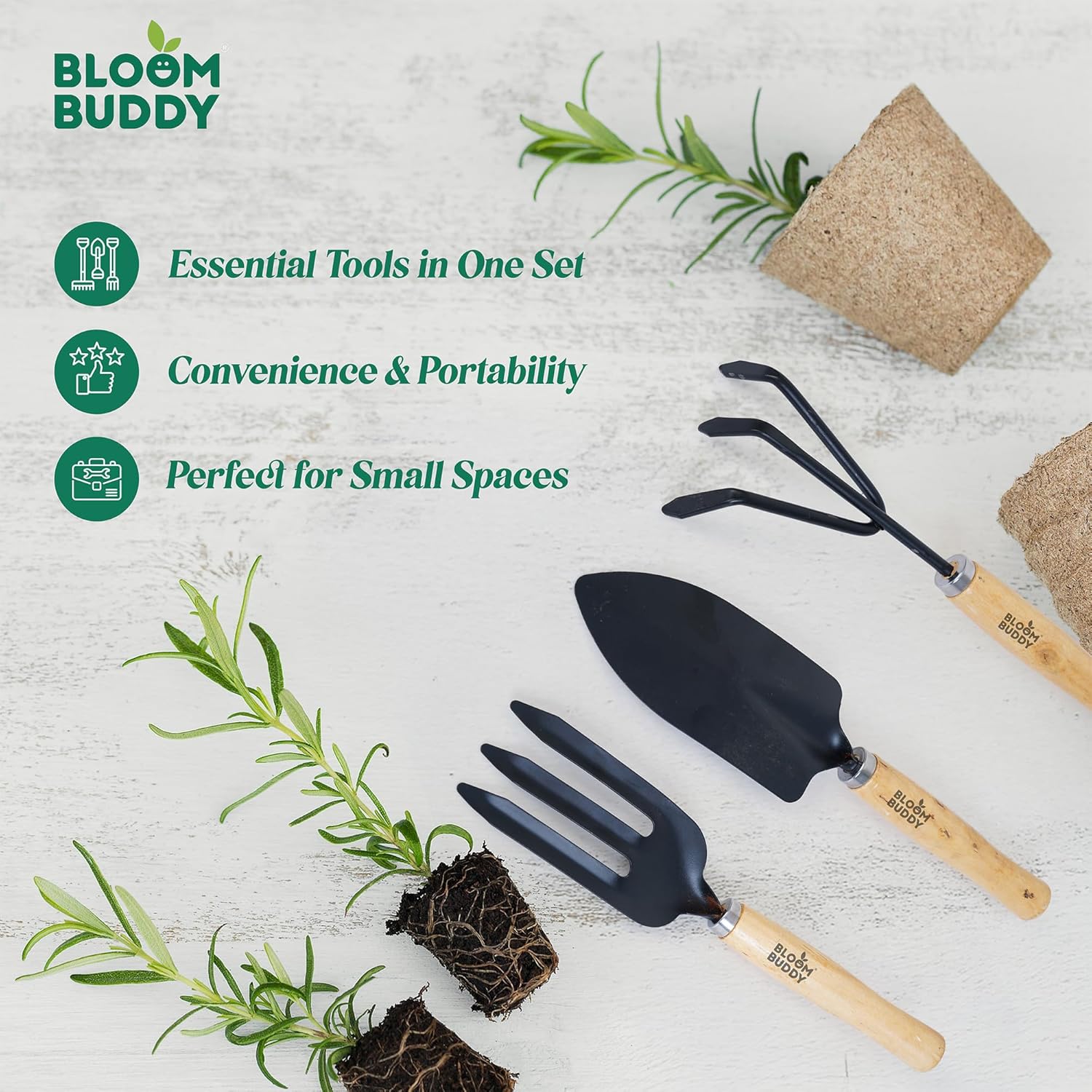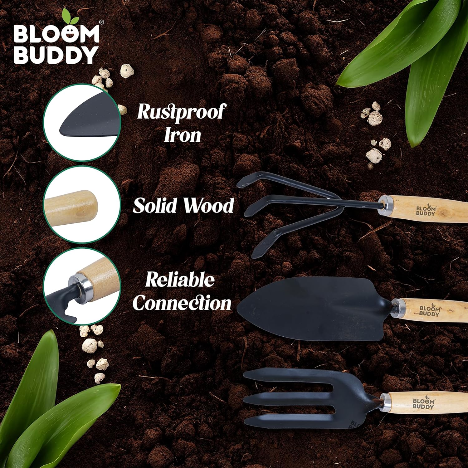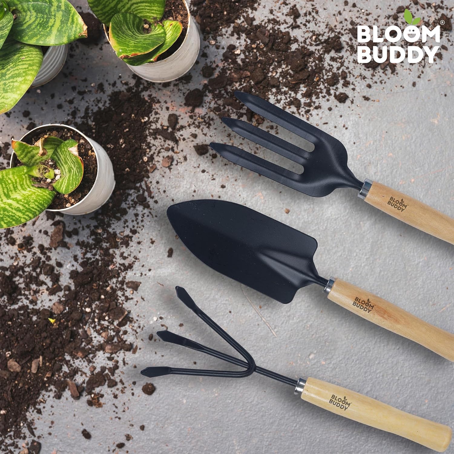 Bloom Buddy 3-Piece Premium Garden Tool Set (10-inch) | Elegant Wooden Handle Gardening Kit – Hand Trowel, Hand Cultivator & Hand Weeder | Durable, Rust-Resistant Tools for Home & Terrace Garden