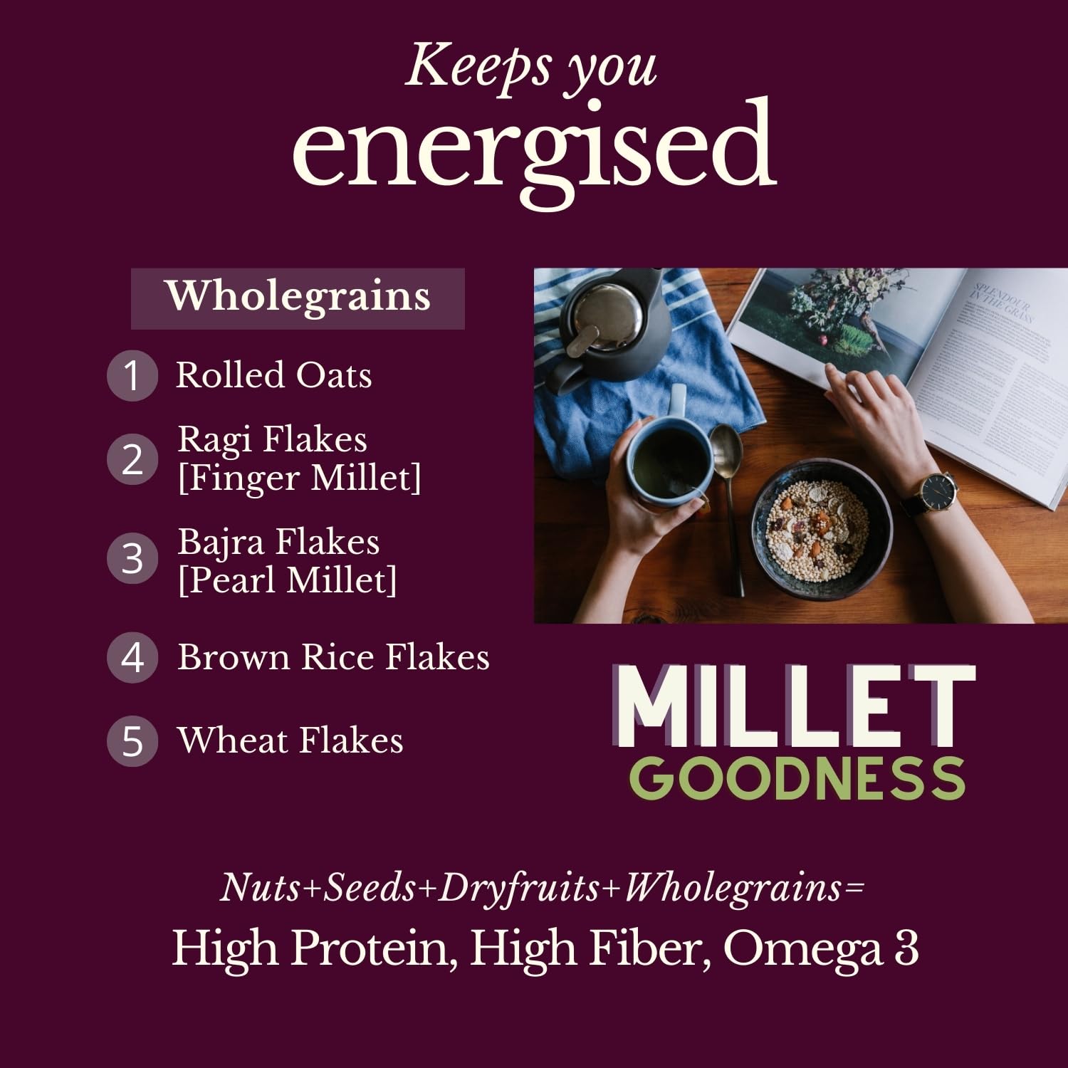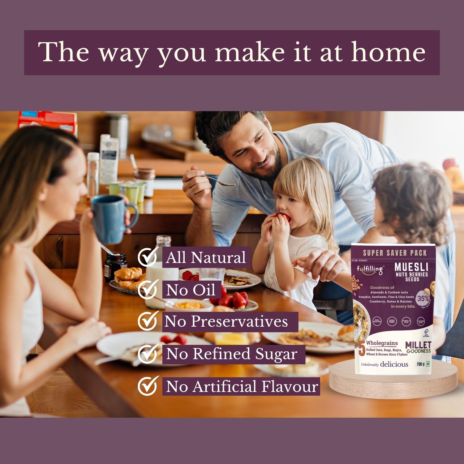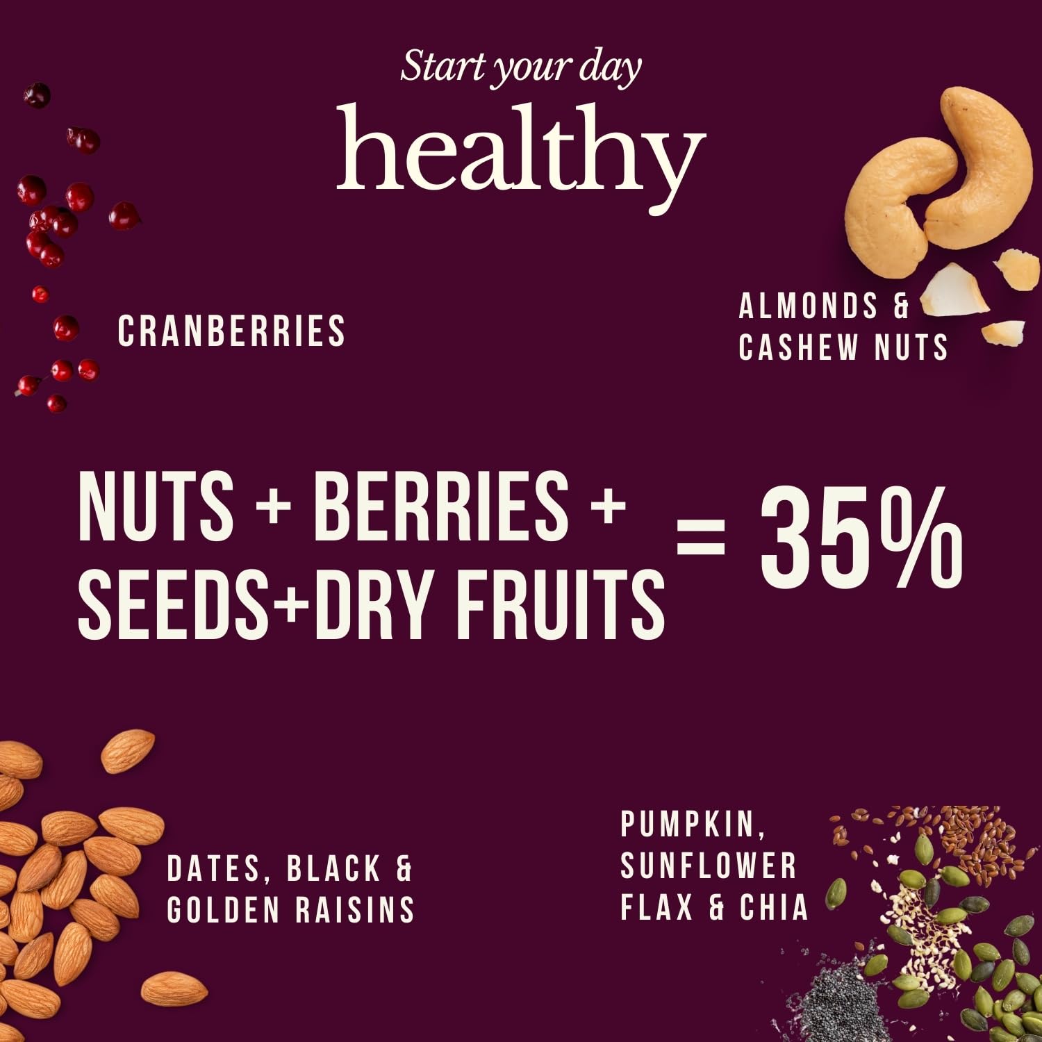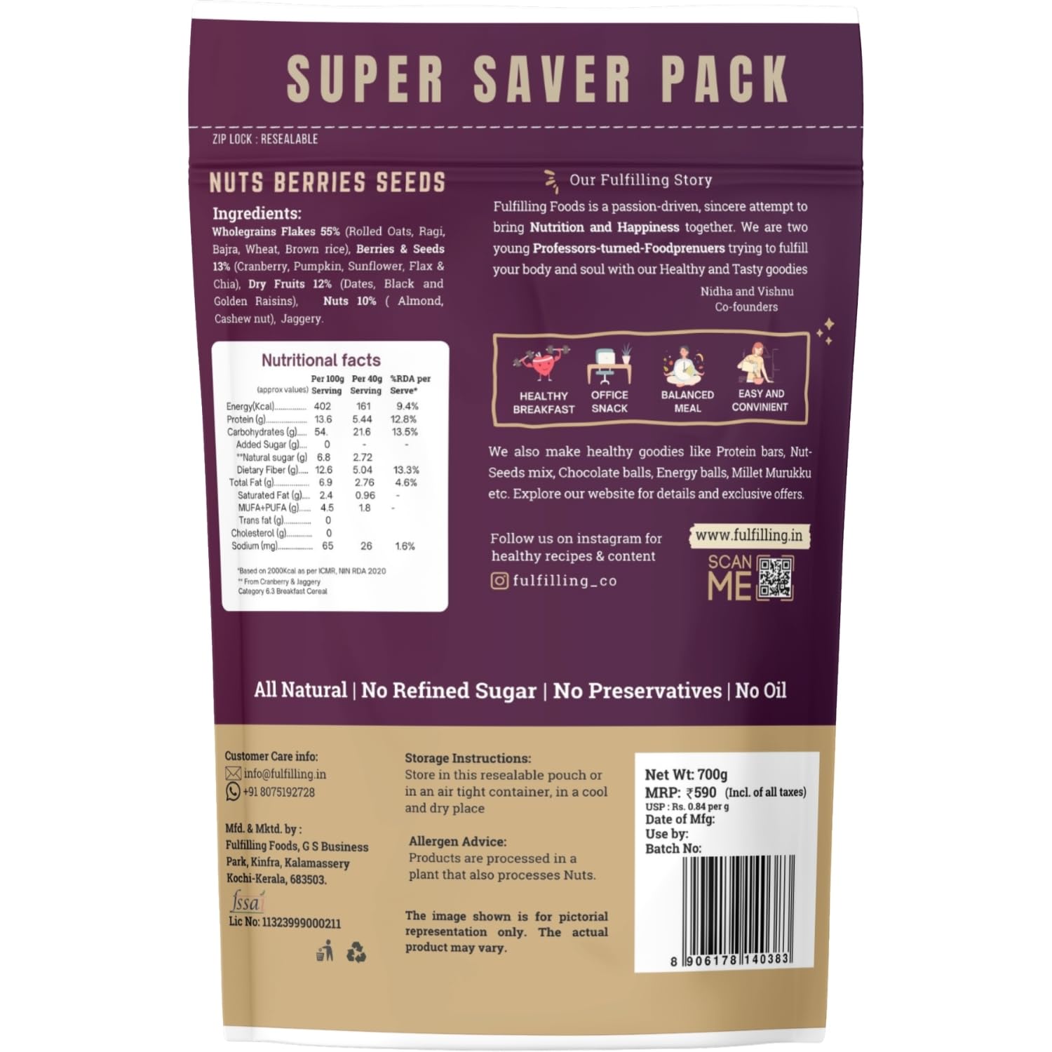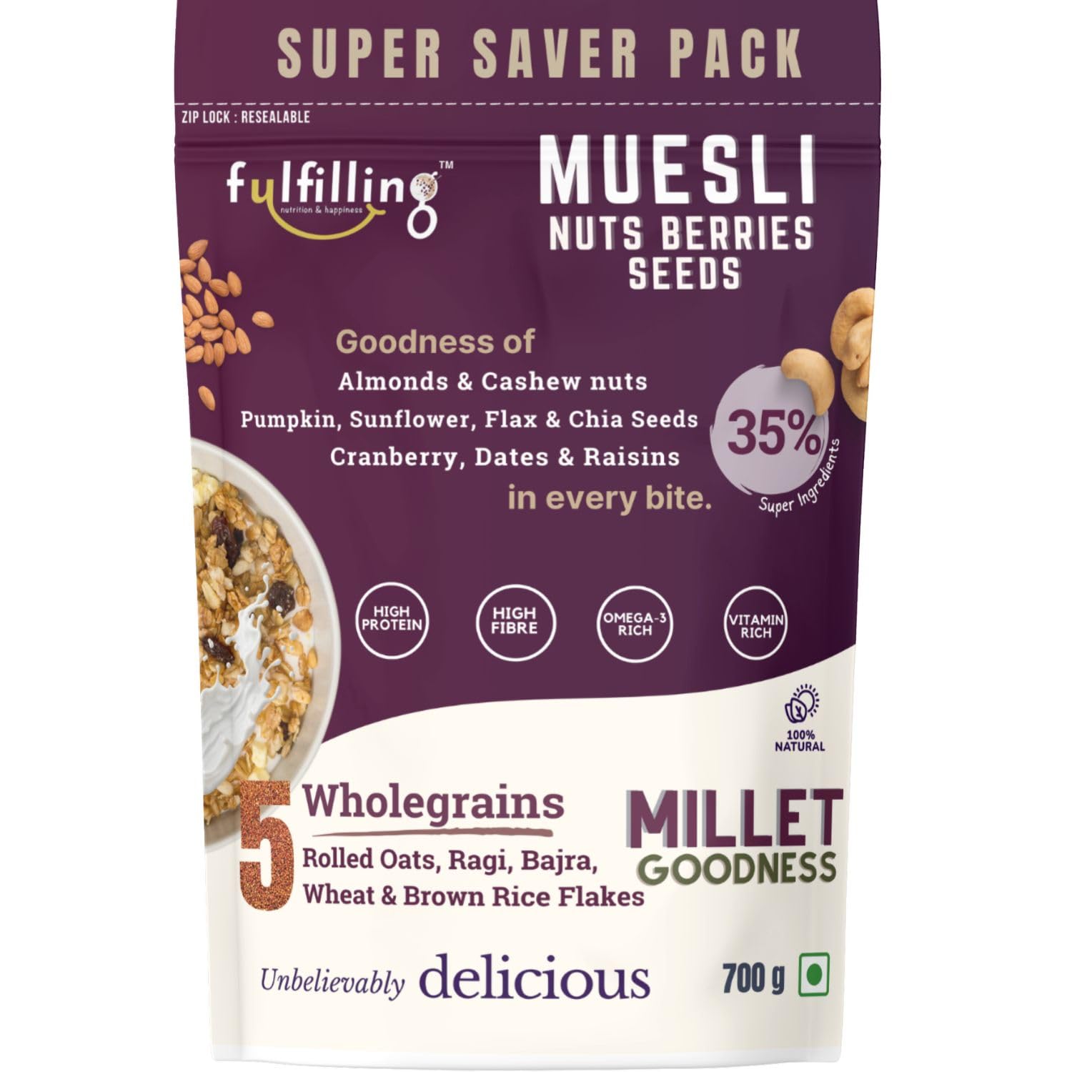 Fulfilling Muesli Fruit & Nuts – Nuts Berries Seeds | Pumpkin, Flax & Chia Seeds, Antioxidant Rich Cranberry, Rolled Oats + Millet Flakes | No Refined Sugar, Healthy Breakfast 700g