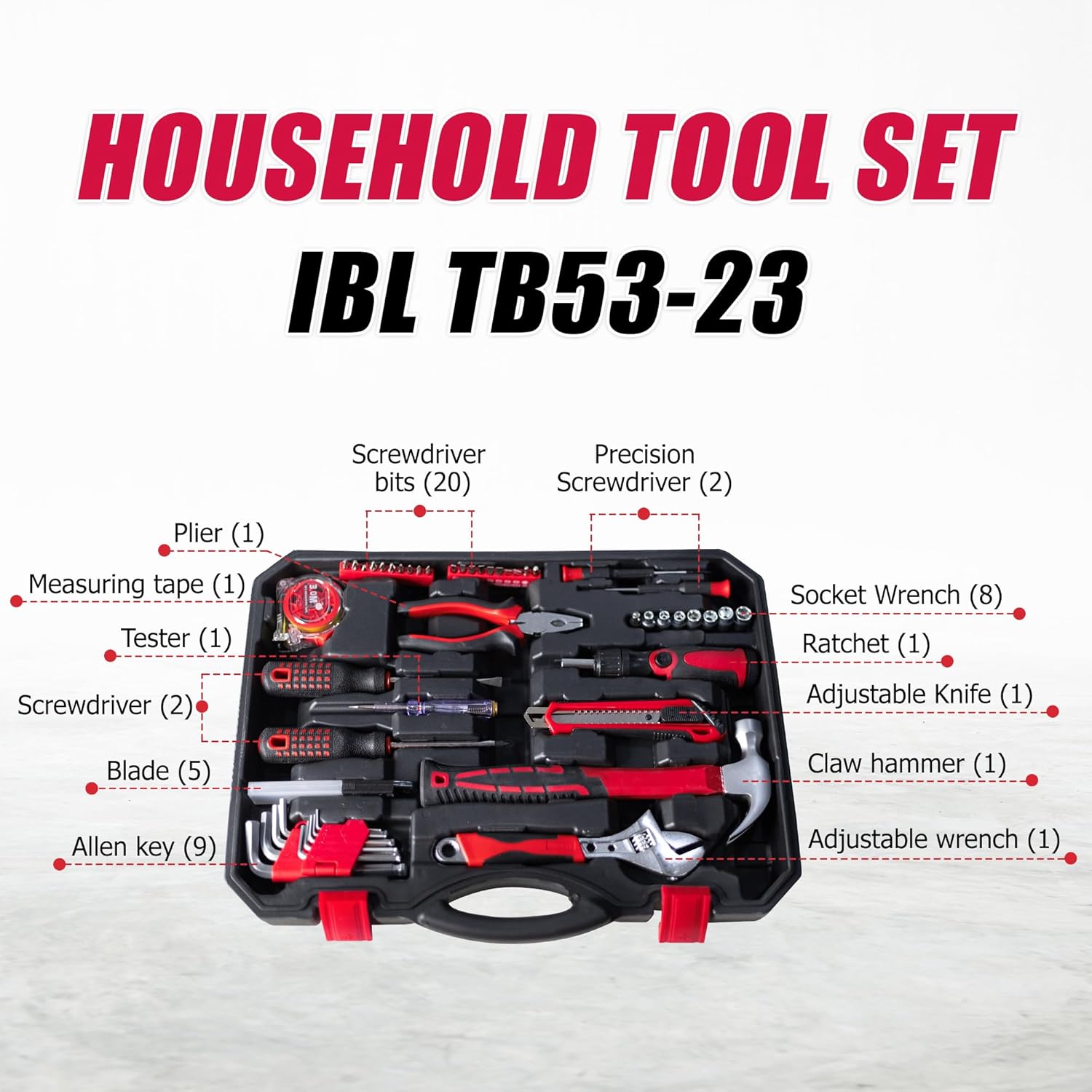 IBELL TB53-23 Hand Tool Kit for Home & DIY Use (53-Piece) – Includes Screwdriver, Wrench, Ratchet, Utility Knife, Saw, Claw Hammer, Measuring Tape and Plier, Multicolor