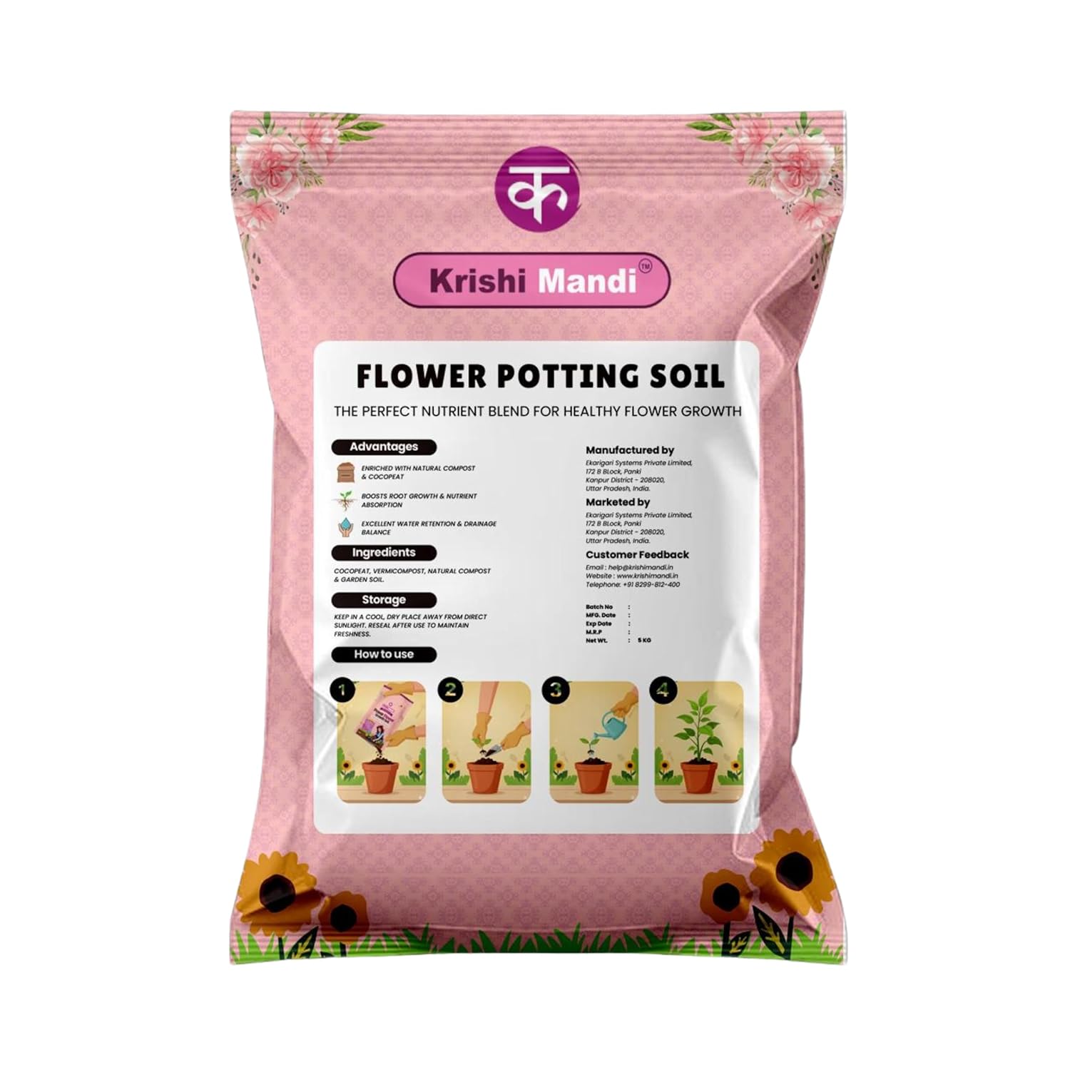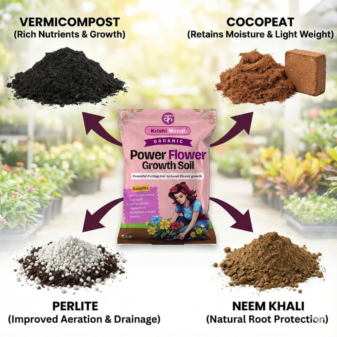 Krishi Mandi Organic Power Flower Growth Soil – Premium Potting Mix with Cocopeat & Compost – Best Soil for Rose, Hibiscus & All Flowering Plants – Boosts Heavy Blooming (5 Kg)