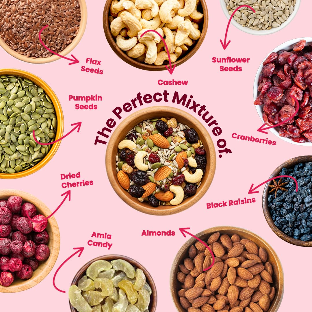 LIVYOR Healthy Mix Nuts, Seeds and Berries Combo Pack – 400Gm | Mix Dry Fruits | Trail Mix | Cashews & Almonds | Black Raisins | Pumpkin | Sunflower & Flax | Cranberries | Cherries & Dried Amla