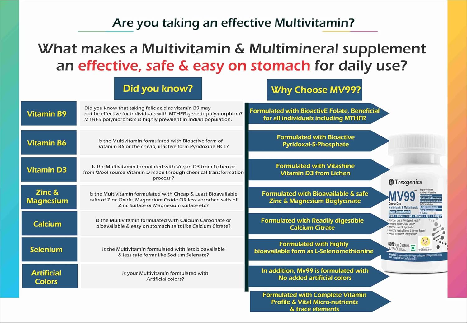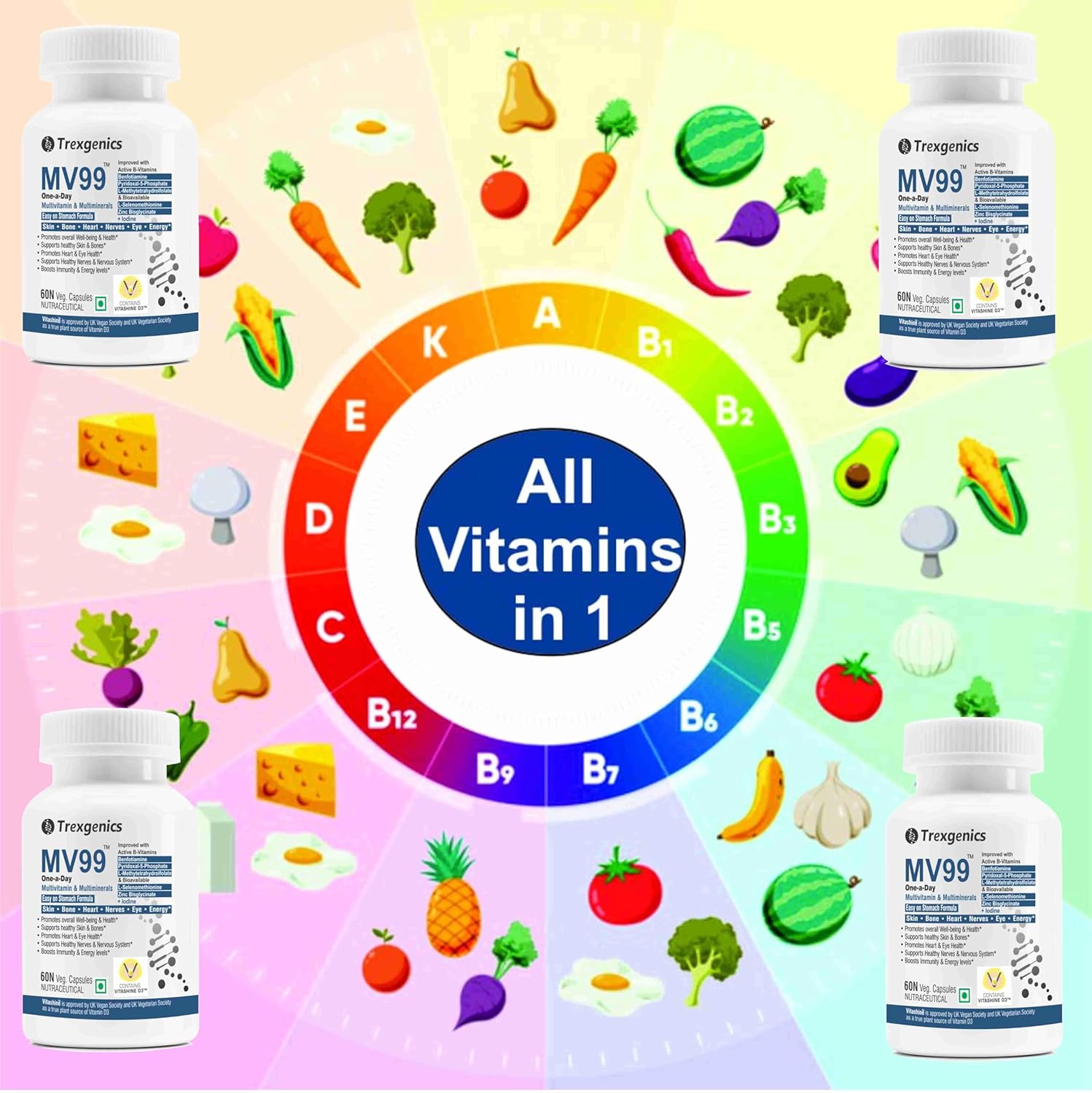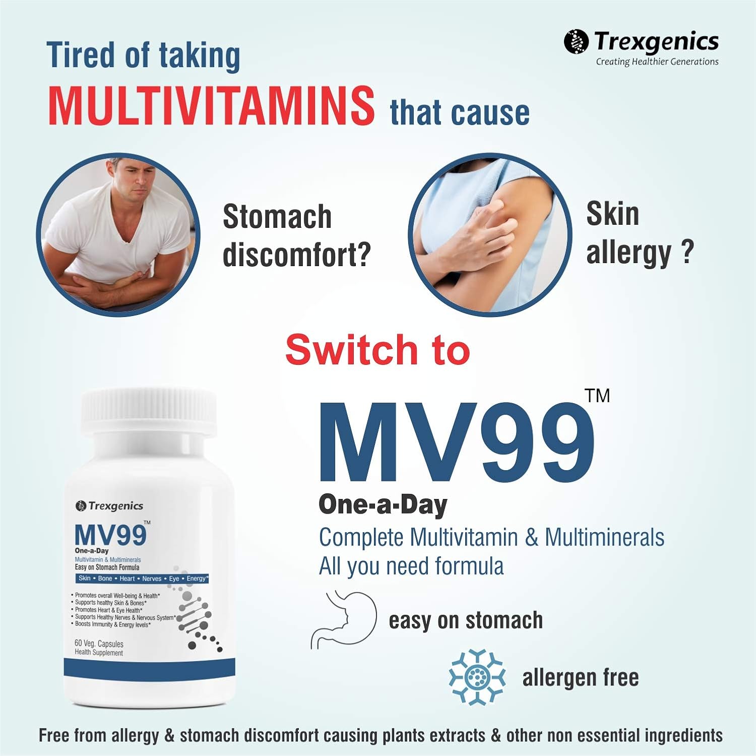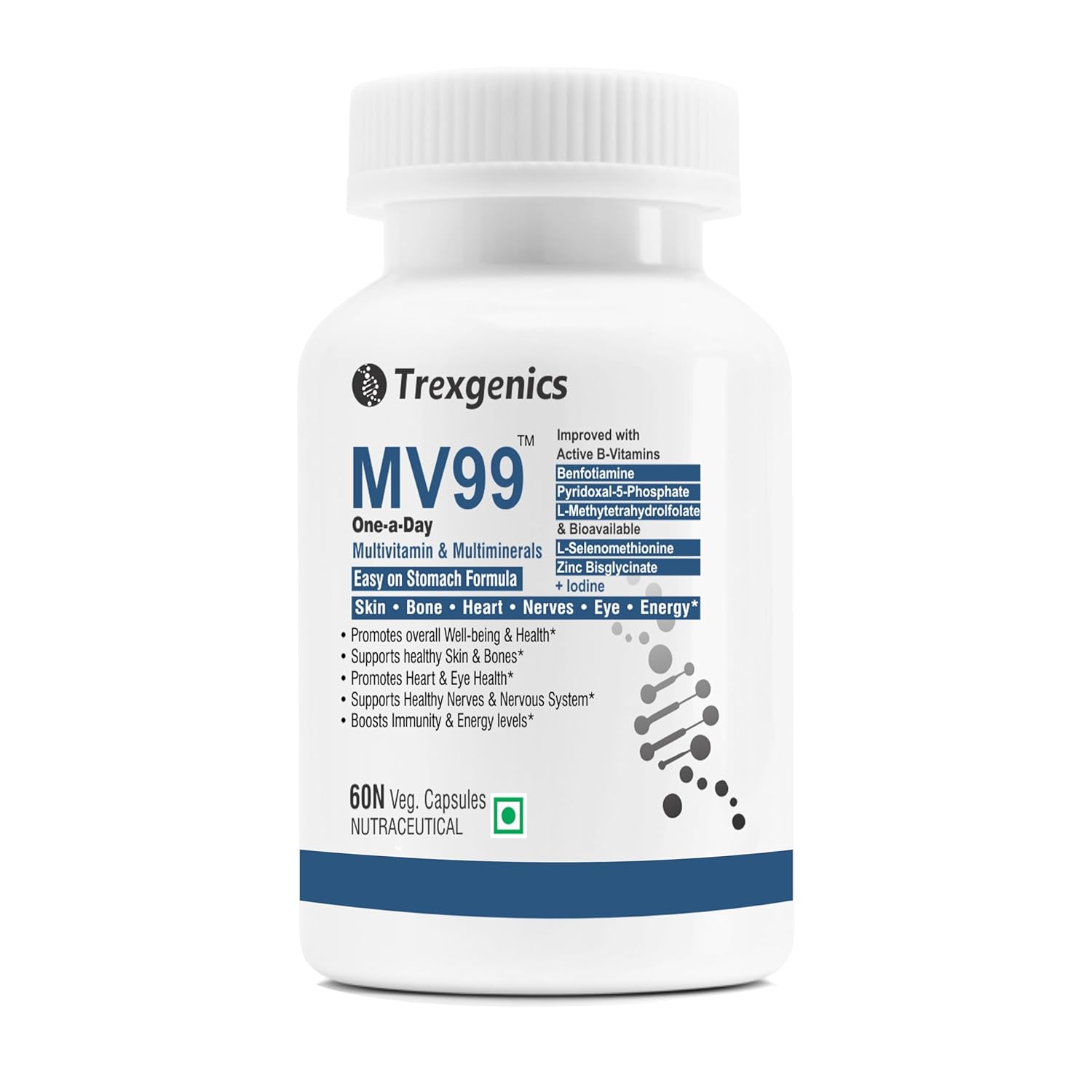 Trexgenics MV99 Multivitamin One-a-day Easy On Stomach – Complete Daily All you need with Multiminerals & Micronutrients for Men & Women (60 Veg. Capsules) (1)